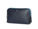 Crafted from premium pebble-grain leather, this navy blue pouch with bold blue zipper keeps essentials organized in style.