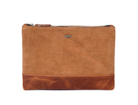 Crafted from soft brown suede with durable crocodile-patterned leather trim, this pouch is designed for both style and practicality.