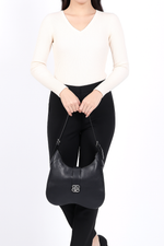With its sleek crescent silhouette (approx. 28cm width x 23cm height x 6cm depth), it drapes naturally against the body, adding a touch of structure without losing softness. The adjustable shoulder strap ensures a comfortable fit whether worn on the shoulder or in hand.